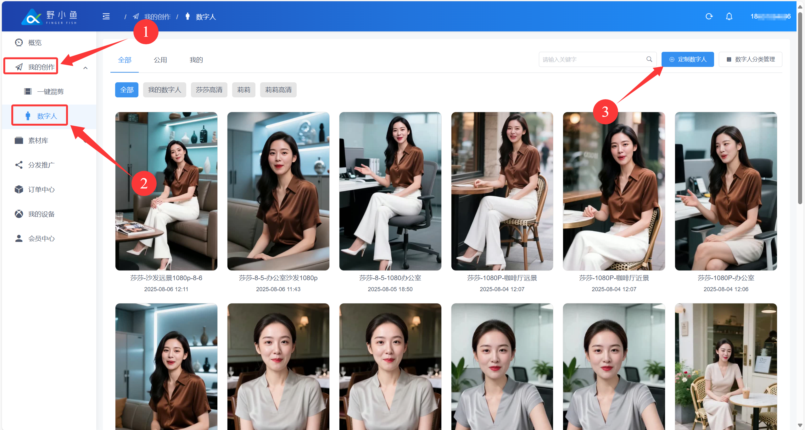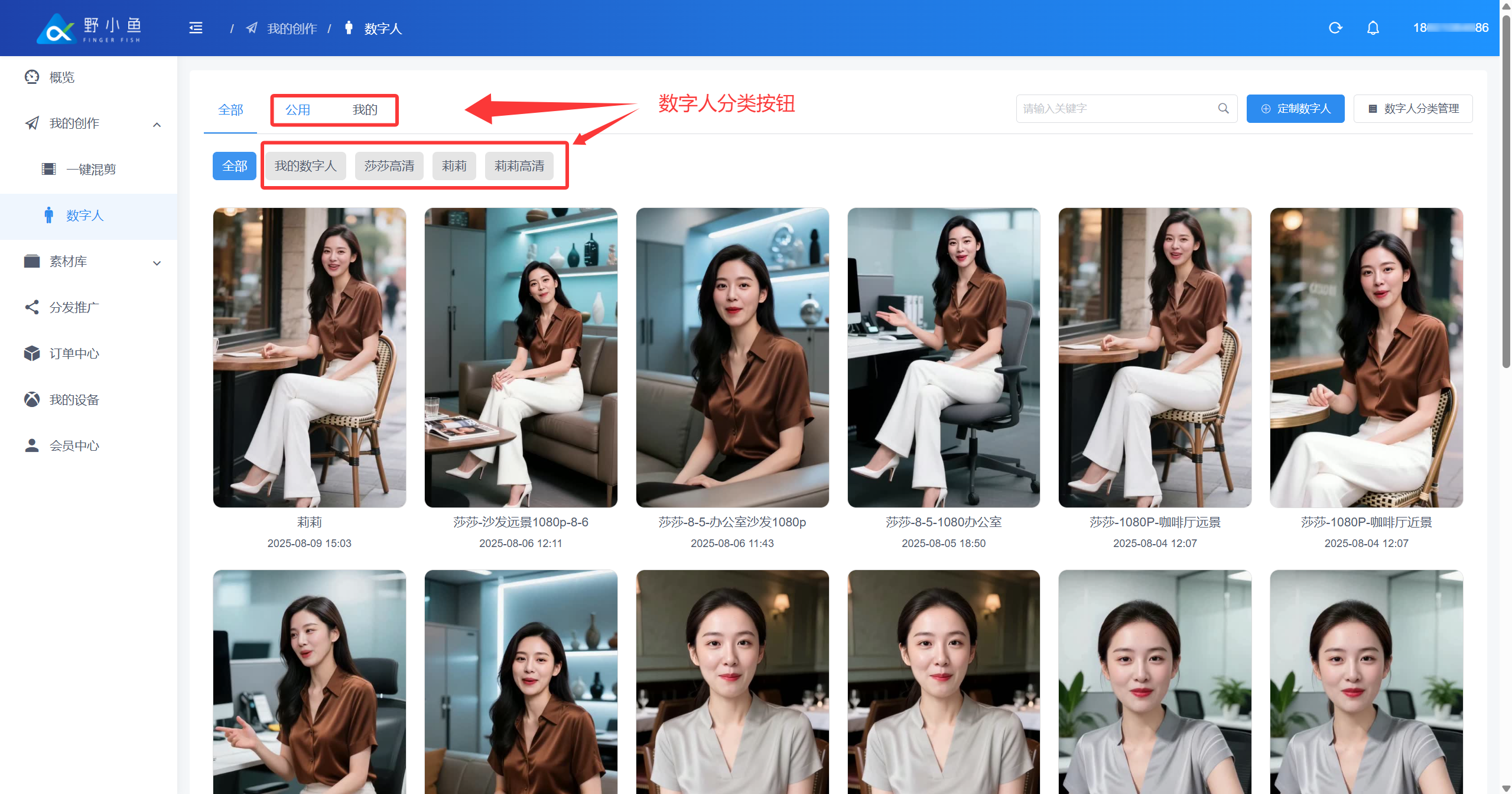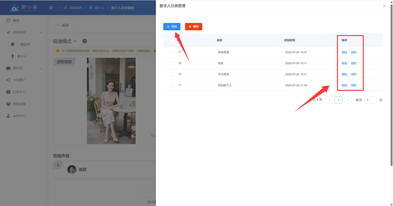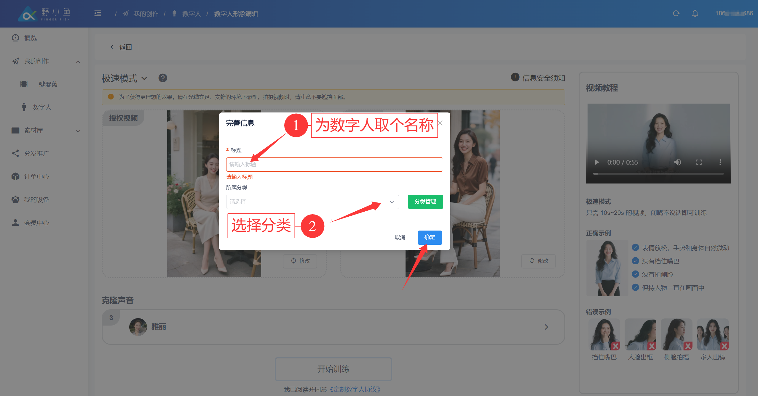 ## 1、【数字分身】功能介绍 上传一段人物正面拍摄素材,野小鱼Ai Box通过专业技术,**可以快速复刻真人形象,高度还原人物相貌、表情和行为**,为您打造独一无二的数字形象分身。在您创作的视频中,这位数字人将为您宣传您的作品,让您的作品更具个性魅力。 ## 2、【数字分身】的好处 **❤️ 提升视频播放数据** 各大短视频平台上面,人物出镜视频的播放数据相比于其他视频类型视频要好。数字分身是复刻人物真实形象,利用数字分身制作的短视频,视频播放数据相比于其他视频类型视频要好。 **❤️ 起到降本增效的作用** 在制作短视频的时候,数字形象分身可以替代真人,解放了真人的时间和劳动力,大幅提高了视频生产制作效率。 **❤️ 打造更加优质的人设、增强品牌形象** 企业可以制作专业、时尚的数字人,为企业塑造品牌形象,增强市场竞争力。 ## 3、【数字分身】常见种类及效果 🚀️ 目前市面上常见的数字人分为:**虚拟数字人**、**绿幕数字人**、**实景数字人**、**3D数字人** ### 1、虚拟数字人 **操作**:通过一张正面照片,生成数字分身形象; **优势**:不需要拍摄视频,付出的时间成本最少; **劣势**:通过照片生成的数字形象,没有表情,说话时嘴型刻意,不具备任何信任感; **案例展示**:[https://v.douyin.com/ijFbARHu/ ](https://v.douyin.com/ijFbARHu/) ### 2、绿幕数字人 **操作**:通过拍摄人物在绿幕背景下的素材,生成数字分身形象; **优势**:绿幕背景可以随意替换成其他背景,视频背景多元化; **劣势**:需要搭建专业的绿幕拍摄场景,成本较高,且绿幕抠像情况下; **案例展示**:[https://v.douyin.com/ijFpeq1Q/ ](https://v.douyin.com/ijFpeq1Q/) [ ](https://v.douyin.com/ijFpeq1Q/) ### 3、实景数字人 **操作**:通过拍摄人物在实际背景下的素材,生成数字分身形象; **优势**:实际背景拍摄,**增加用户的信任度,且拍摄方便**; **劣势**:实际背景需要和视频画面有关联,不能过于突兀; **案例展示**:[https://v.douyin.com/ijFgDmnP/](https://v.douyin.com/ijFgDmnP/) ### 4、3D数字人 **操作**:通过3D建模,语言、动作训练等操作,生成数字分身形象; **优势**:能让人感受到形象的立体感,视频画面显得精彩; **劣势**:成本最高,目前无法制作真人的3D数字形象; **案例展示**:[https://v.douyin.com/ijFpnLhC/](https://v.douyin.com/ijFpnLhC/) 👍 **数字分身适用于各行各业,大多数应用于需要真人出镜,提高客户信任度的产品。** **❤️** 适用场景案例 | 营销类型视频 | [https://v.douyin.com/ij2SQTbu/](https://v.douyin.com/ij2SQTbu/) | | ---------------- | ------------------------------------------------------------- | | 情感类型视频 | [https://v.douyin.com/ij2Swguh/](https://v.douyin.com/ij2Swguh/) | | 知识付费类型 | [https://v.douyin.com/ij2SXBjm/](https://v.douyin.com/ij2SXBjm/) | | 新闻资讯类型视频 | [https://v.douyin.com/ij2A1dMu/](https://v.douyin.com/ij2A1dMu/) | ## 5、【创建数字分身】需要准备材料 #### 1、拍摄人物数字分身的肖像授视频;  #### 2、拍摄人物数字分身的训练视频;  **👀️ 注意事项**:拍摄训练视频,人脸面部不能有任何遮挡,视频时长在只需 **10s\~20s** 的视频,闭嘴不说话也可训练,详情可参考以下视频。 👍 **正确示例**  **😕 错误示例** |  |  |  |  | | :-------------------------------------------------------------------------------- | --------------------------------------------------------------------------------- | --------------------------------------------------------------------------------- | --------------------------------------------------------------------------------- | | 挡住嘴巴 | 人脸出框 | 侧脸拍摄 | 多人出镜 | #### **3、功能入口**: 进入野小鱼Ai Box用户管理端:[https://b.bytide.net/](https://b.bytide.net/) ## **6、【定制数字人分身】操作步骤:** 准备好授权视频和训练视频后,接下来进行以下具体步骤: #### 1、点击左侧“我的创作”→点击“数字人” #### 2、再点右上方“定制数字人”如下图:  #### 3、上传授权形象视频   #### 4、上传训练视频   #### 5、选择配音音色   训练数字人,声音音色的选择可以随意选择,在生成专属视频时选择的音色为最终效果。 [音色克隆查看 >>>](https://help.bytide.net/knowbase/document/352.html) #### 6、开始训练  #### 7、数字人形象分类  #### 8、数字人分类管理  点击“分类管理”  可添加、素材、编辑修改分类名称  数字人生成中  已完成数字人列表