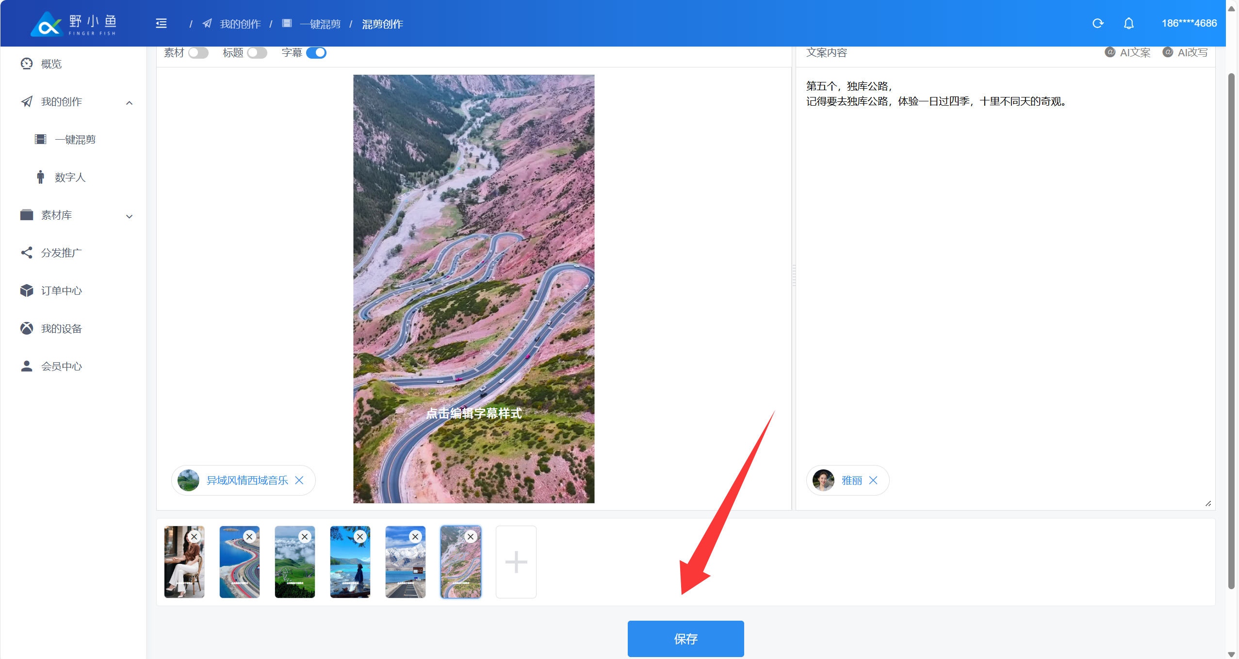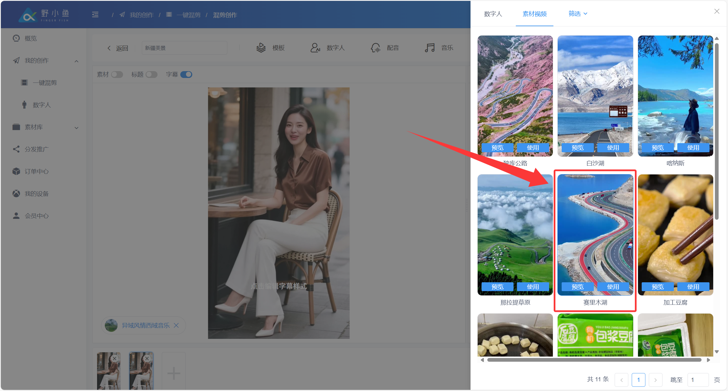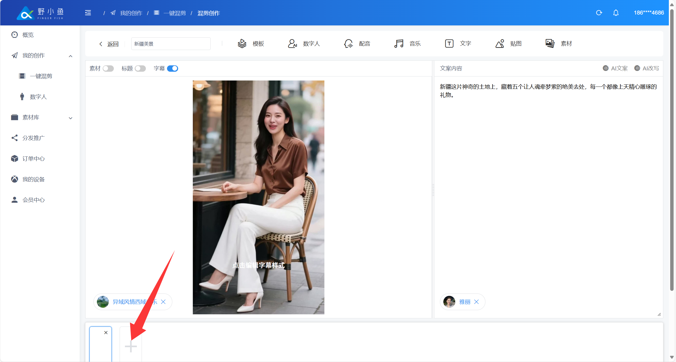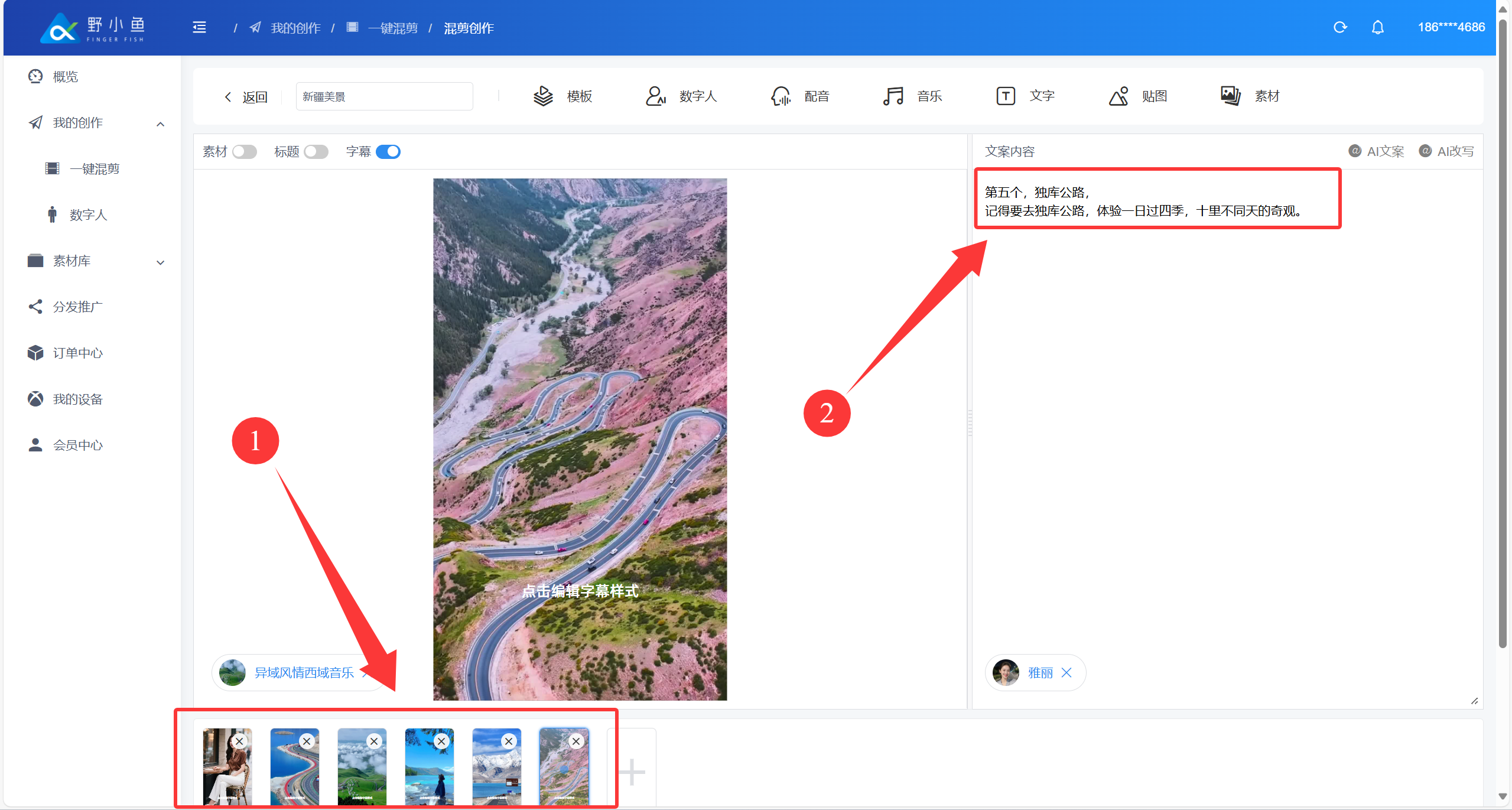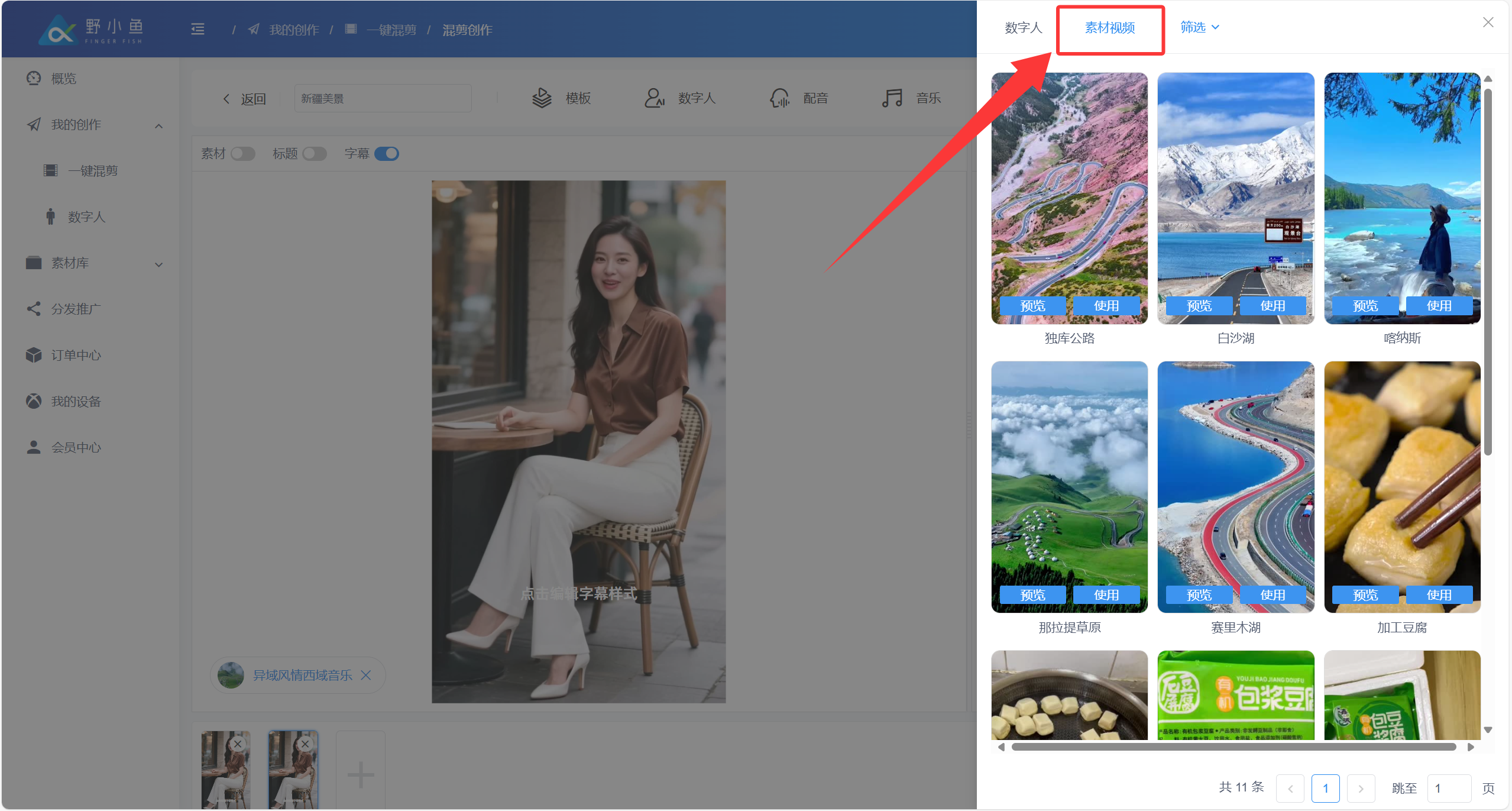 > **❤️** **多场景混剪视频的优点** > > 能通过时空跳跃制造强烈视觉冲击,让信息密度呈指数级提升。 > > 不同场景的快速切换,既能用对比突出核心主题,又能用蒙太奇手法串联起碎片化故事,在短时间内唤起观众多重情绪。 > > 这种形式尤其适合展现过程变化、多元视角或密集亮点,比如旅行 vlog 里的城市与自然切换、产品宣传中的功能与场景融合。它打破了单一叙事的沉闷,用节奏张力抓住注意力,同时赋予内容更丰富的解读空间。 🚀️多场景混剪视频其实与【多场景切换口播视频】创作教程所讲述创作方式基本相同,通过文案分段方式增加不同的素材或数字人配合进行创作。 #### 1、素材上传 进入野小鱼创作平台:[>>>> 进入野小鱼创作平台](https://b.bytide.net/home/) ###### 1.1 点击“素材库”再找到“视频”按钮,进入视频内容素材上传  ###### 1.2 素材分类管理 点击“视频分类管理”按钮进行分类名称的创建  ###### 1.3 添加分类 点击“添加”按钮进行分类名称创建  添加分类名称例如:新疆旅游,添加后点击“确定”按钮即可  创建完成关闭页面或在左侧看不出鼠标点击左键即可关闭。  ###### 1.4 素材上传 创建完成分类后,在素材分类标签则会增加一个新的分类名称; 接下来点击右侧“上传视频”按钮,进行素材素材;  ###### 1.5 添加视频内容以及视频的名称,分类  ###### 1.6 可通过本地上传(即存储在自己电脑中的素材);也可以通过视频链接进行上传。  ###### 1.7 在电脑中查找需要上传的内容素材,点击“打开”  ###### 1.8 点击“确定”按钮  ###### 1.9 添加文件名称、选择分类、点击“确定”  ###### 1.10 素材添加成功  1.11 依次类推进行多条素材上传  #### 2、视频创作 2.1 点击“我的创作”下的“一键混剪”按钮  ###### 2.2 新增创作 点击右上角的“新增创作”进入创作面板  ###### 2.3 选择数字人 点击“数字人”按钮,依然选择本次需要使用的数字人形象  ###### 2.4 挑选适合出镜的数字人  ###### 2.5 添加字幕  2.5.1 调整字幕样式 点击字幕文字编辑框,对字体样式、颜色等进行适当调整  ###### 2.6 添加配音 选择适合的音色进行配音  ###### 2.7 添加背景音乐  2.7.1 选择适合的背景音乐  2.7.2 点击音乐名称,对背景音乐音量进行调节,如果有口播朗读建议背景音乐小于25%  ###### 2.8 添加文案 添加完整文案的第一部分(根据你的画面要求,自行控制文案内容与画面)  ###### 2.9 添加新画面  2.9.1 点击以添加的新画面,再进行画面的替换,点击“数字人”按钮  2.9.2 点击“素材视频”按钮  2.9.3 选择第二段文案匹配的画面素材,点击素材上的“使用”按钮  2.9.4 更换第二段素材是需要的文案内容  2.9.5 依次类推添加剩余画面和文案内容,并做内容检查是否画面与文字对应; 点击画面中的分页,即可对应文字内容,逐一检查,确认无误即可。  2.9.6 确认后点击“保存”  2.9.7 再次确认进行生成点击“确定”  2.9.8 点击“返回”即可回到创作列表等待视频生成结果  2.9.9 返回创作列表即可新增创作任务执行中  2.9.10 新创作任务完成 点击视频中的“下载”图标即可保存到本地,点击视频即可进行视频预览  > **本期教学旨在分享使用制作流程,大家可按照你的行业、文案对画面进行可控切换创作。** > > **例如:带货视频、企业宣传、店铺推荐、人文历史等均可创作!** ❤️ **教学视频成片欣赏** https://download.bytide.cn/171_1754886861617.mp4