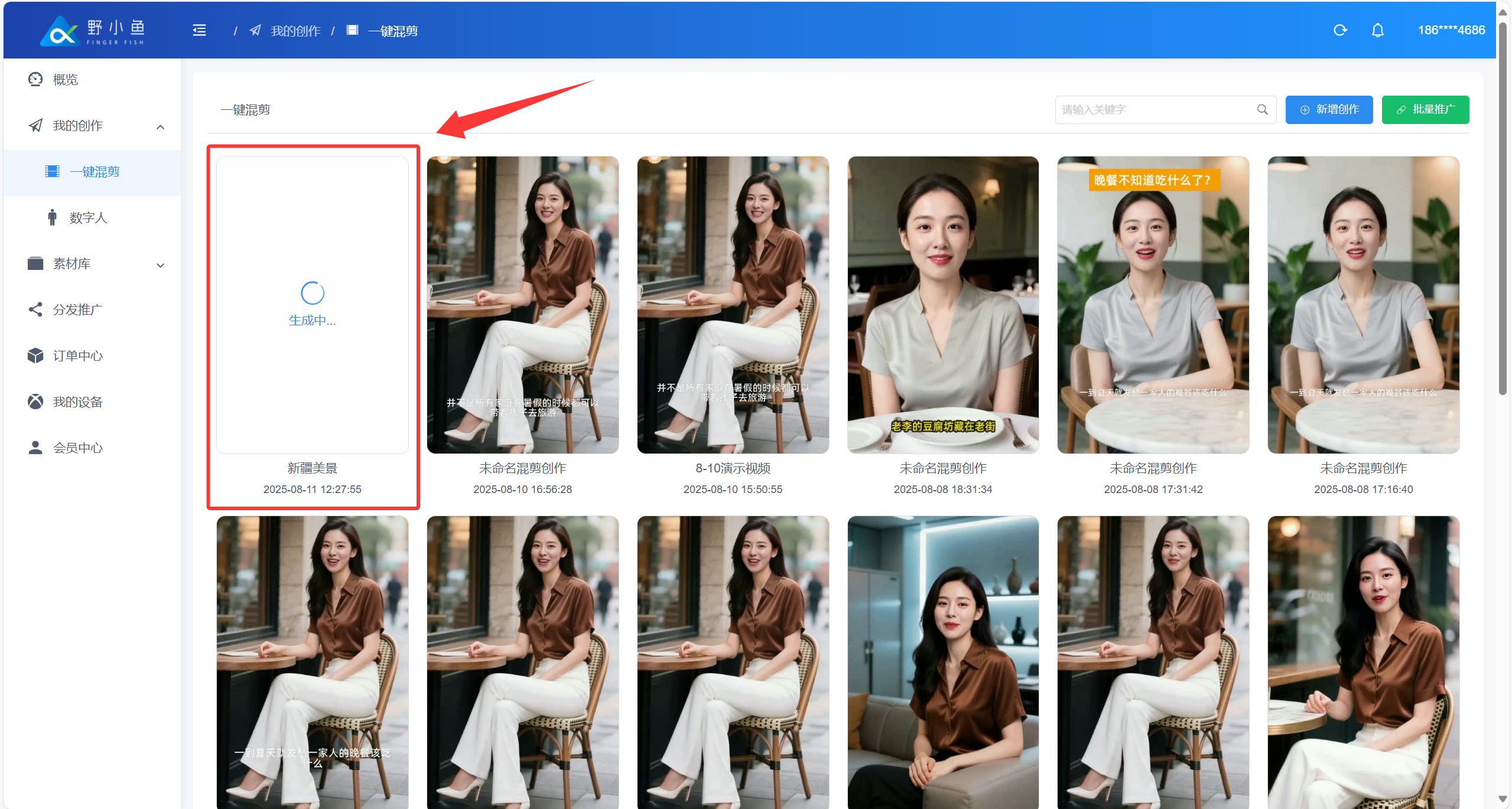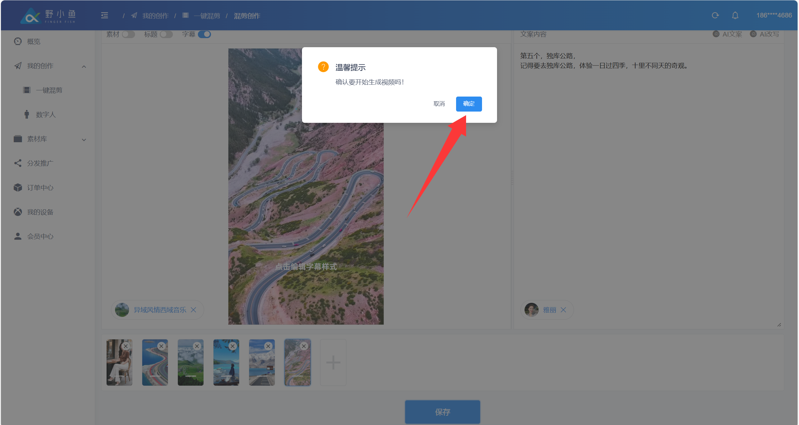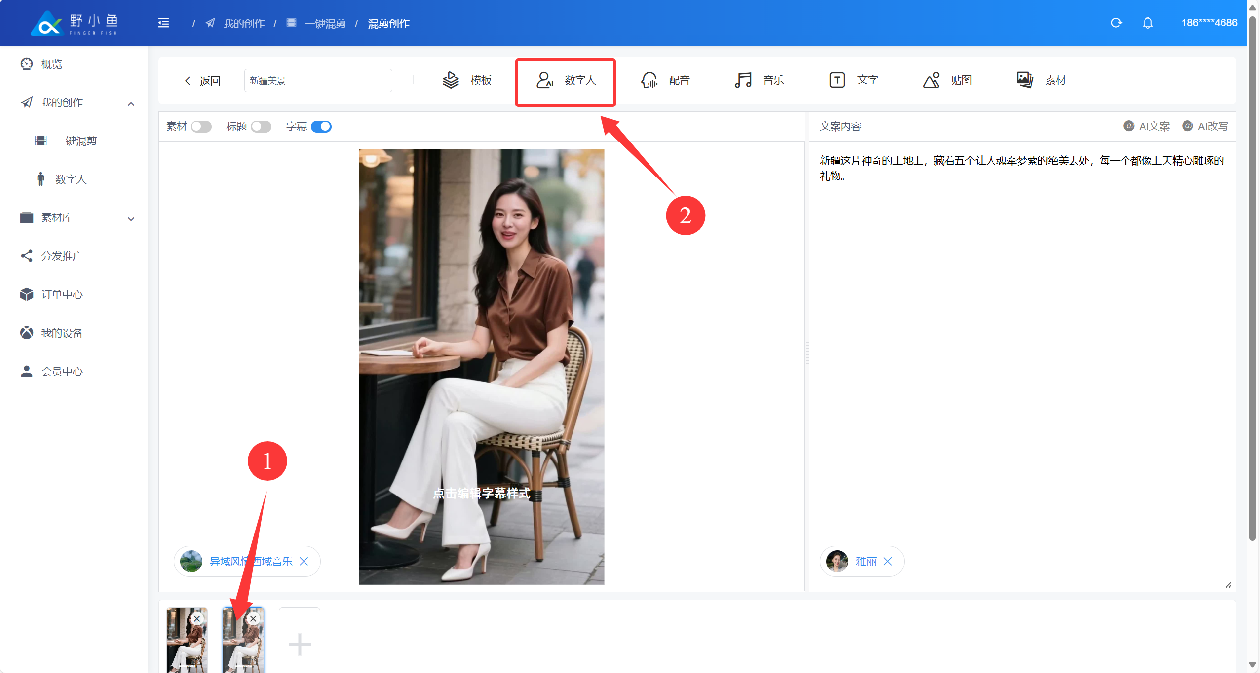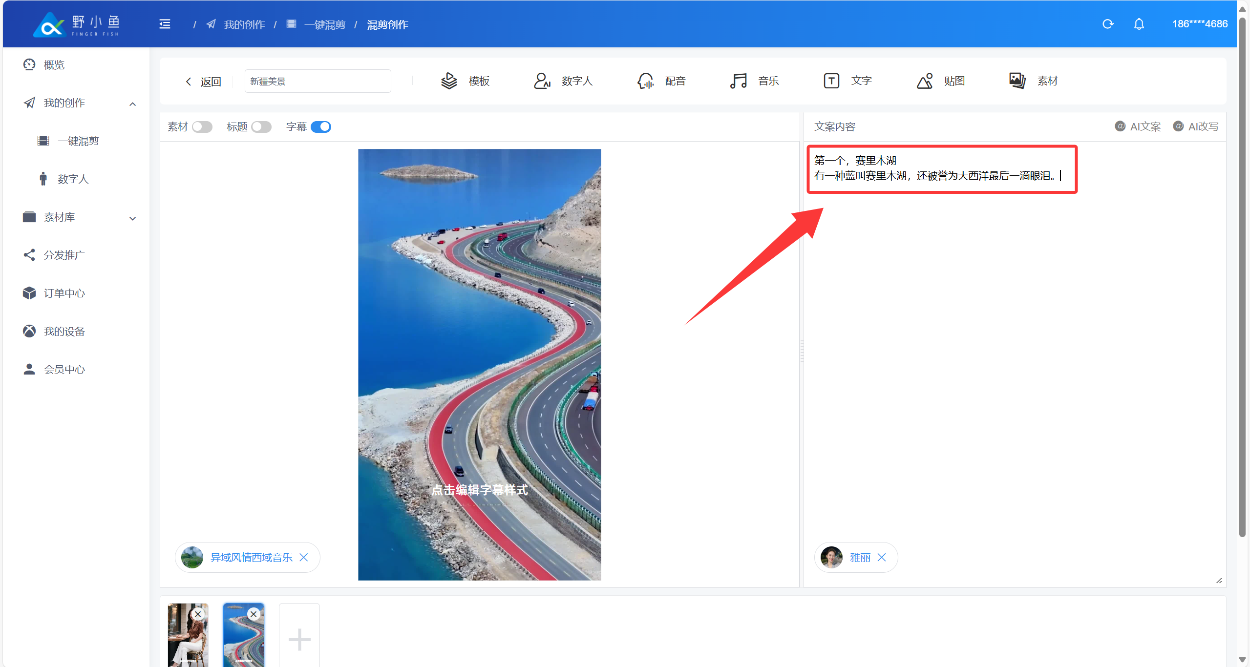 > **❤️** **多场景混剪视频的优点** > > 能通过时空跳跃制造强烈视觉冲击,让信息密度呈指数级提升。 > > 不同场景的快速切换,既能用对比突出核心主题,又能用蒙太奇手法串联起碎片化故事,在短时间内唤起观众多重情绪。 > > 这种形式尤其适合展现过程变化、多元视角或密集亮点,比如旅行 vlog 里的城市与自然切换、产品宣传中的功能与场景融合。它打破了单一叙事的沉闷,用节奏张力抓住注意力,同时赋予内容更丰富的解读空间。 🚀️多场景混剪视频其实与【多场景切换口播视频】创作教程所讲述创作方式基本相同,通过文案分段方式增加不同的素材或数字人配合进行创作。 #### 1、素材上传 进入野小鱼创作平台:[>>>> 进入野小鱼创作平台](https://b.bytide.net/home/) ###### 1.1 点击“素材库”再找到“视频”按钮,进入视频内容素材上传  ###### 1.2 素材分类管理 点击“视频分类管理”按钮进行分类名称的创建  ###### 1.3 添加分类 点击“添加”按钮进行分类名称创建  添加分类名称例如:新疆旅游,添加后点击“确定”按钮即可  创建完成关闭页面或在左侧看不出鼠标点击左键即可关闭。  ###### 1.4 素材上传 创建完成分类后,在素材分类标签则会增加一个新的分类名称; 接下来点击右侧“上传视频”按钮,进行素材素材;  ###### 1.5 添加视频内容以及视频的名称,分类  ###### 1.6 可通过本地上传(即存储在自己电脑中的素材);也可以通过视频链接进行上传。  ###### 1.7 在电脑中查找需要上传的内容素材,点击“打开”  ###### 1.8 点击“确定”按钮  ###### 1.9 添加文件名称、选择分类、点击“确定”  ###### 1.10 素材添加成功  1.11 依次类推进行多条素材上传  #### 2、视频创作 2.1 点击“我的创作”下的“一键混剪”按钮  ###### 2.2 新增创作 点击右上角的“新增创作”进入创作面板  ###### 2.3 选择数字人 点击“数字人”按钮,依然选择本次需要使用的数字人形象  ###### 2.4 挑选适合出镜的数字人  ###### 2.5 添加字幕  2.5.1 调整字幕样式 点击字幕文字编辑框,对字体样式、颜色等进行适当调整  ###### 2.6 添加配音 选择适合的音色进行配音  ###### 2.7 添加背景音乐  2.7.1 选择适合的背景音乐  2.7.2 点击音乐名称,对背景音乐音量进行调节,如果有口播朗读建议背景音乐小于25%  ###### 2.8 添加文案 添加完整文案的第一部分(根据你的画面要求,自行控制文案内容与画面)  ###### 2.9 添加新画面  2.9.1 点击以添加的新画面,再进行画面的替换,点击“数字人”按钮  2.9.2 点击“素材视频”按钮  2.9.3 选择第二段文案匹配的画面素材,点击素材上的“使用”按钮  2.9.4 更换第二段素材是需要的文案内容  2.9.5 依次类推添加剩余画面和文案内容,并做内容检查是否画面与文字对应; 点击画面中的分页,即可对应文字内容,逐一检查,确认无误即可。  2.9.6 确认后点击“保存”  2.9.7 再次确认进行生成点击“确定”  2.9.8 点击“返回”即可回到创作列表等待视频生成结果  2.9.9 返回创作列表即可新增创作任务执行中  2.9.10 新创作任务完成 点击视频中的“下载”图标即可保存到本地,点击视频即可进行视频预览  > **本期教学旨在分享使用制作流程,大家可按照你的行业、文案对画面进行可控切换创作。** > > **例如:带货视频、企业宣传、店铺推荐、人文历史等均可创作!** ❤️ **教学视频成片欣赏** https://download.bytide.cn/171_1754886861617.mp4