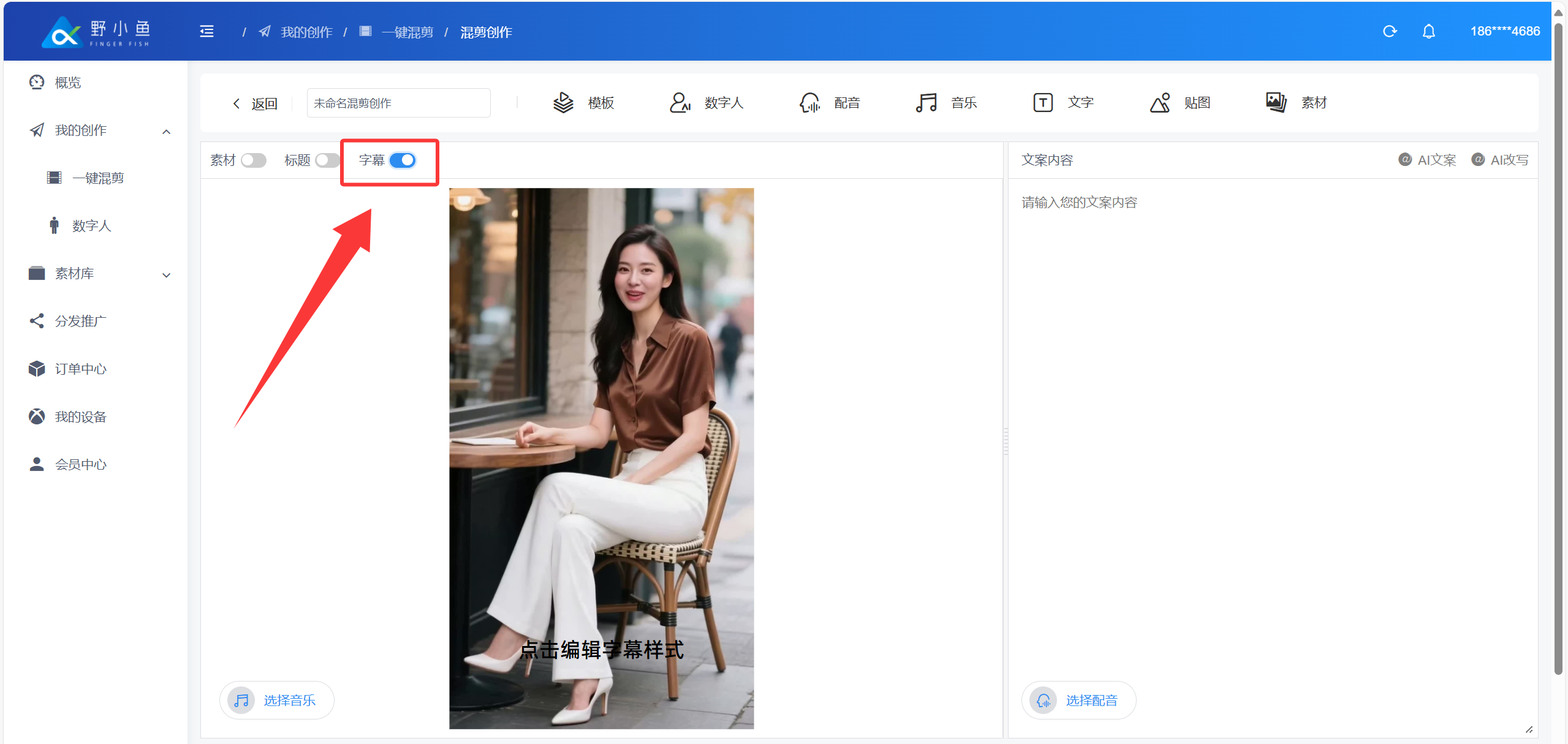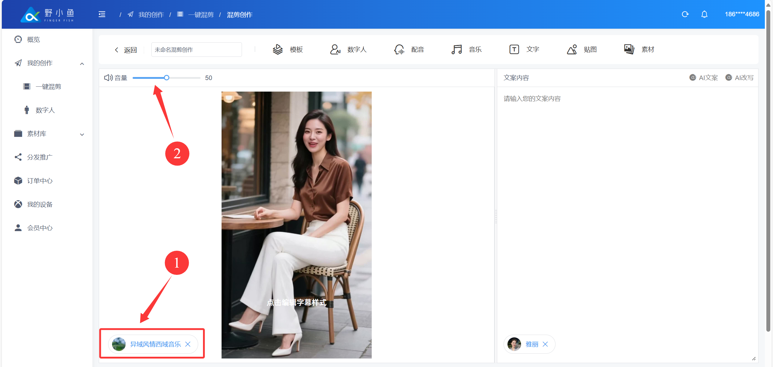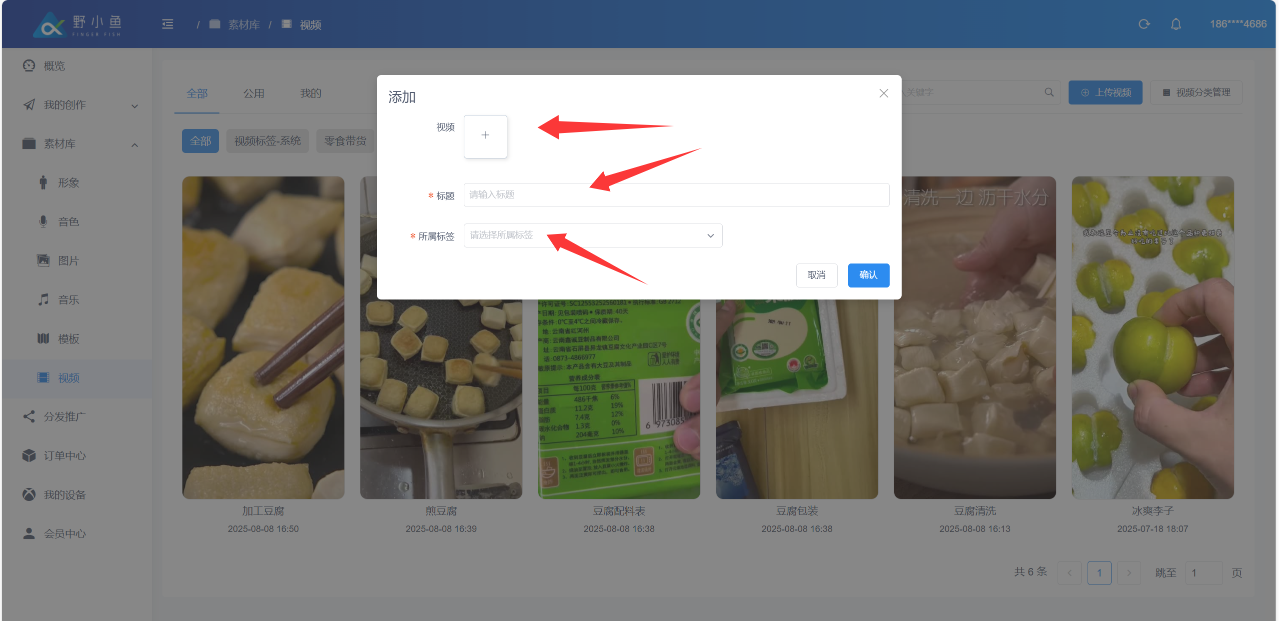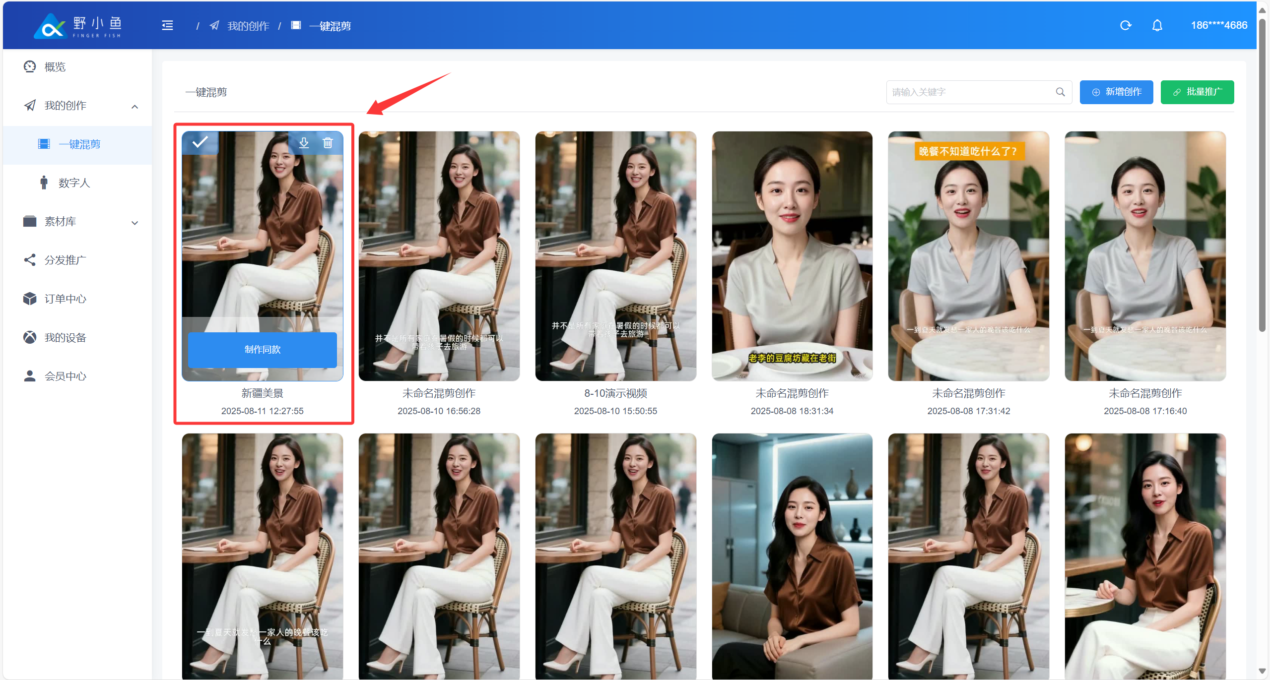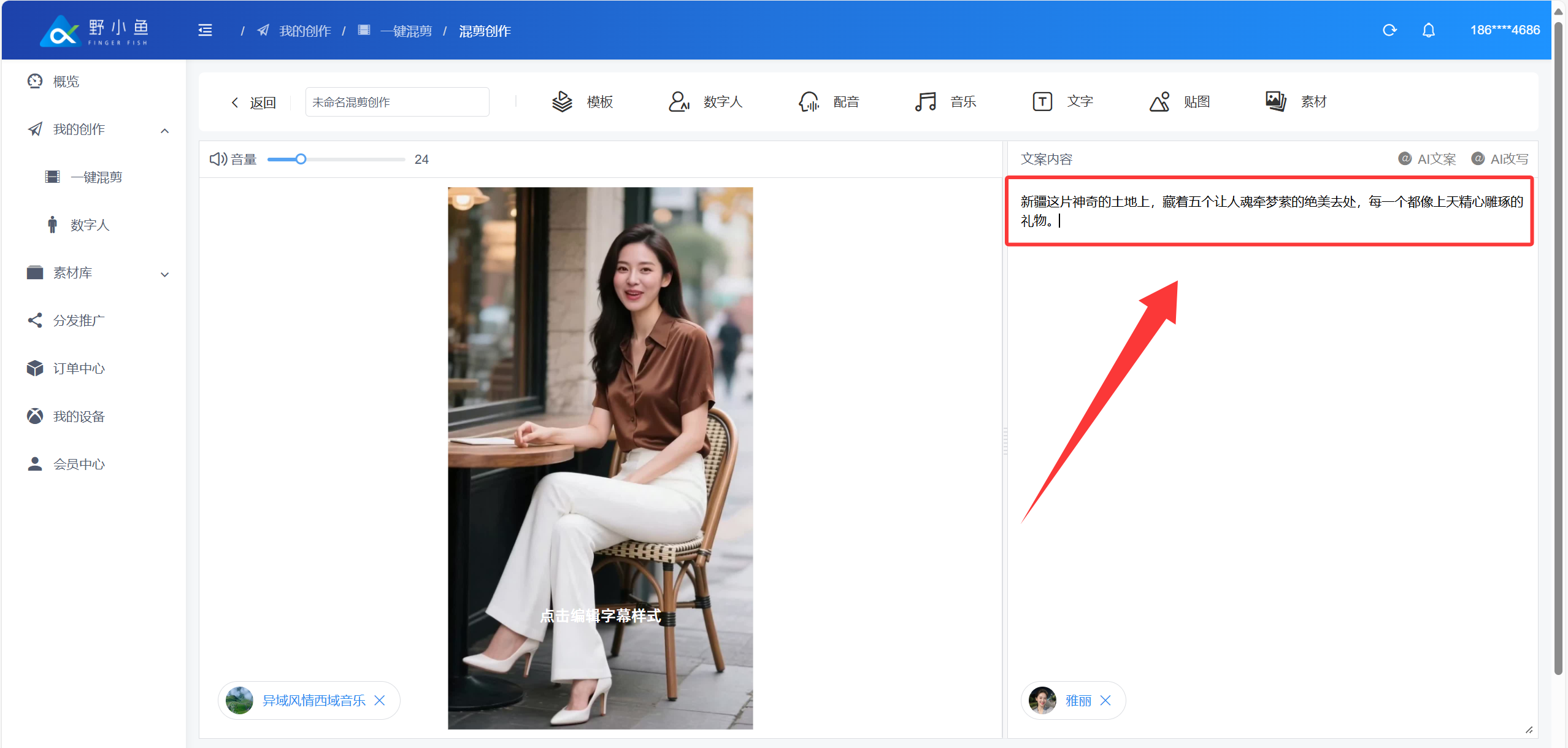 > **❤️** **多场景混剪视频的优点** > > 能通过时空跳跃制造强烈视觉冲击,让信息密度呈指数级提升。 > > 不同场景的快速切换,既能用对比突出核心主题,又能用蒙太奇手法串联起碎片化故事,在短时间内唤起观众多重情绪。 > > 这种形式尤其适合展现过程变化、多元视角或密集亮点,比如旅行 vlog 里的城市与自然切换、产品宣传中的功能与场景融合。它打破了单一叙事的沉闷,用节奏张力抓住注意力,同时赋予内容更丰富的解读空间。 🚀️多场景混剪视频其实与【多场景切换口播视频】创作教程所讲述创作方式基本相同,通过文案分段方式增加不同的素材或数字人配合进行创作。 #### 1、素材上传 进入野小鱼创作平台:[>>>> 进入野小鱼创作平台](https://b.bytide.net/home/) ###### 1.1 点击“素材库”再找到“视频”按钮,进入视频内容素材上传  ###### 1.2 素材分类管理 点击“视频分类管理”按钮进行分类名称的创建  ###### 1.3 添加分类 点击“添加”按钮进行分类名称创建  添加分类名称例如:新疆旅游,添加后点击“确定”按钮即可  创建完成关闭页面或在左侧看不出鼠标点击左键即可关闭。  ###### 1.4 素材上传 创建完成分类后,在素材分类标签则会增加一个新的分类名称; 接下来点击右侧“上传视频”按钮,进行素材素材;  ###### 1.5 添加视频内容以及视频的名称,分类  ###### 1.6 可通过本地上传(即存储在自己电脑中的素材);也可以通过视频链接进行上传。  ###### 1.7 在电脑中查找需要上传的内容素材,点击“打开”  ###### 1.8 点击“确定”按钮  ###### 1.9 添加文件名称、选择分类、点击“确定”  ###### 1.10 素材添加成功  1.11 依次类推进行多条素材上传  #### 2、视频创作 2.1 点击“我的创作”下的“一键混剪”按钮  ###### 2.2 新增创作 点击右上角的“新增创作”进入创作面板  ###### 2.3 选择数字人 点击“数字人”按钮,依然选择本次需要使用的数字人形象  ###### 2.4 挑选适合出镜的数字人  ###### 2.5 添加字幕  2.5.1 调整字幕样式 点击字幕文字编辑框,对字体样式、颜色等进行适当调整  ###### 2.6 添加配音 选择适合的音色进行配音  ###### 2.7 添加背景音乐  2.7.1 选择适合的背景音乐  2.7.2 点击音乐名称,对背景音乐音量进行调节,如果有口播朗读建议背景音乐小于25%  ###### 2.8 添加文案 添加完整文案的第一部分(根据你的画面要求,自行控制文案内容与画面)  ###### 2.9 添加新画面  2.9.1 点击以添加的新画面,再进行画面的替换,点击“数字人”按钮  2.9.2 点击“素材视频”按钮  2.9.3 选择第二段文案匹配的画面素材,点击素材上的“使用”按钮  2.9.4 更换第二段素材是需要的文案内容  2.9.5 依次类推添加剩余画面和文案内容,并做内容检查是否画面与文字对应; 点击画面中的分页,即可对应文字内容,逐一检查,确认无误即可。  2.9.6 确认后点击“保存”  2.9.7 再次确认进行生成点击“确定”  2.9.8 点击“返回”即可回到创作列表等待视频生成结果  2.9.9 返回创作列表即可新增创作任务执行中  2.9.10 新创作任务完成 点击视频中的“下载”图标即可保存到本地,点击视频即可进行视频预览  > **本期教学旨在分享使用制作流程,大家可按照你的行业、文案对画面进行可控切换创作。** > > **例如:带货视频、企业宣传、店铺推荐、人文历史等均可创作!** ❤️ **教学视频成片欣赏** https://download.bytide.cn/171_1754886861617.mp4
