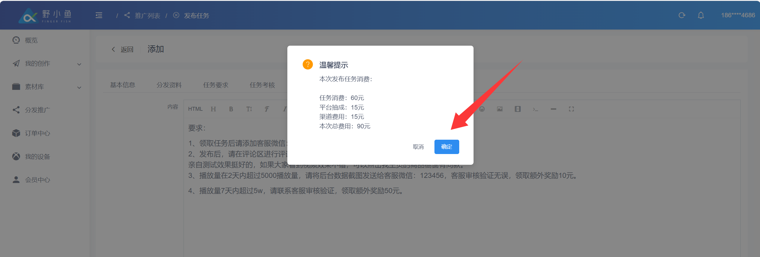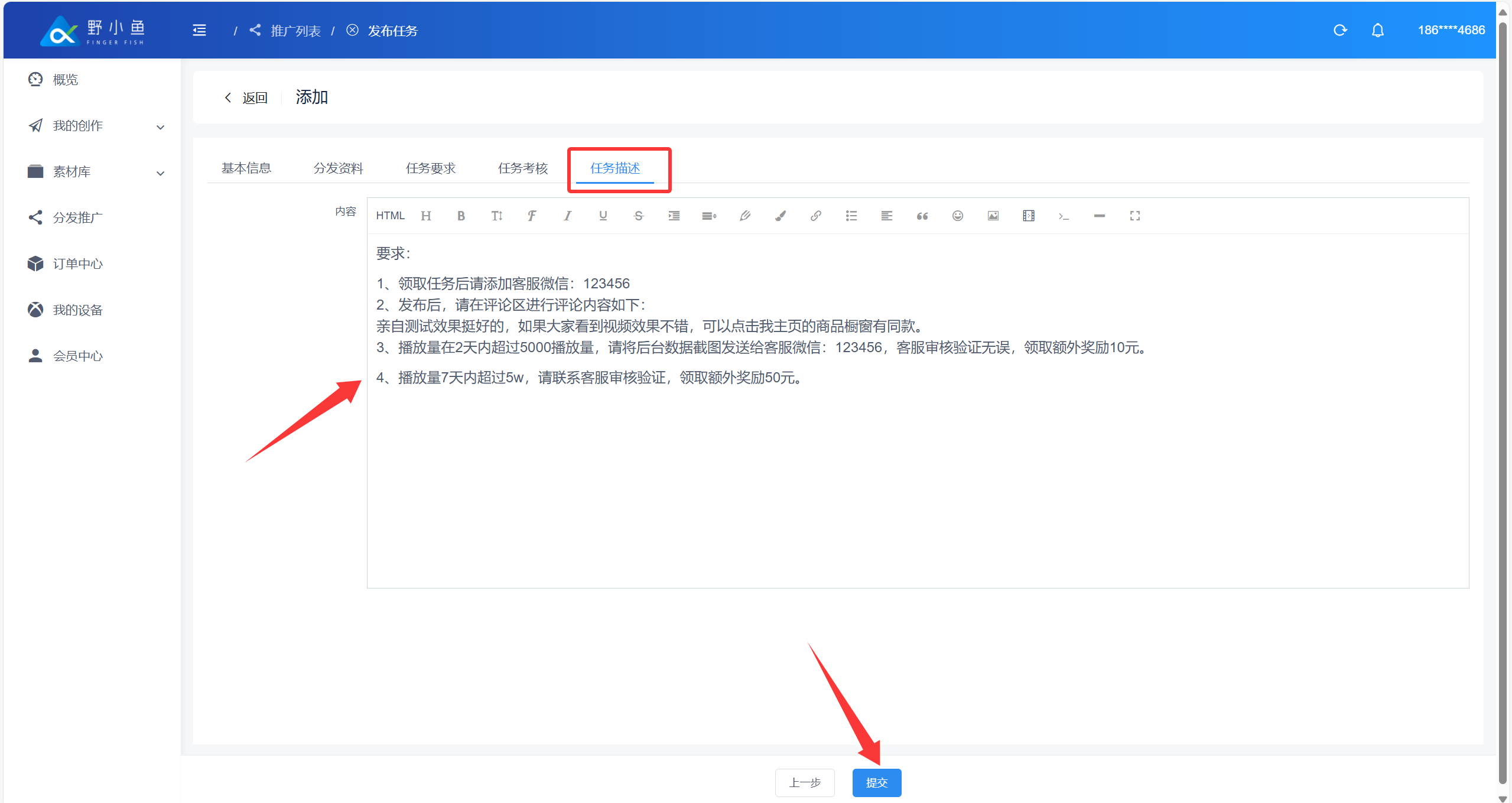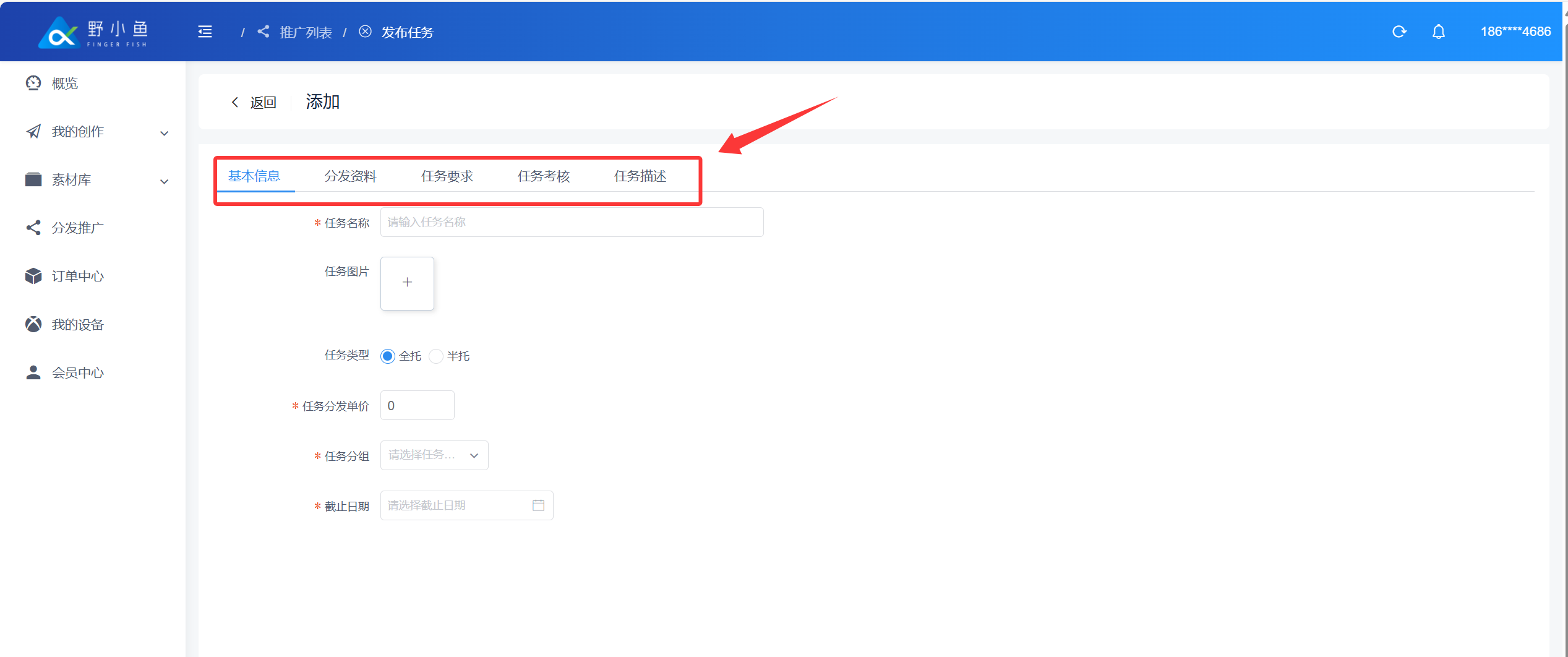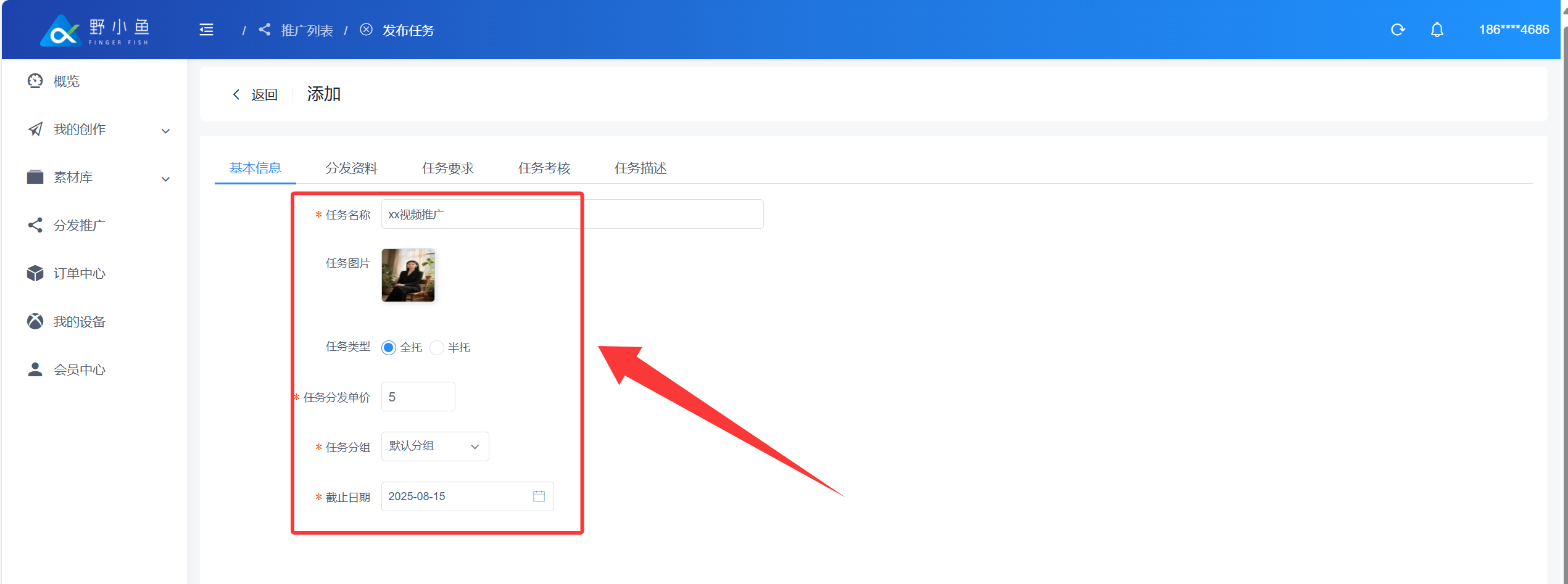 ## 什么是内容分发任务? > ❤️ 内容分发任务是指:企业或个人借助野小鱼任务分发系统,将自身内容(视频)指派给系统连接的 10 万 + 个人分发者(涵盖宝妈、兼职者等群体),由分发者在抖音、快手视频号等平台同步发布,形成传播矩阵的任务形式。 > > 👍 系统通过智能匹配机制,按内容类型自动派单(如美食视频优先推给本地生活类分发者),确保受众匹配度超 80%;企业或个人无需采购更多设备、账号,仅支付 3 - 10 元 / 条的任务佣金,可大幅节省成本。 ## 创建内容分发任务 进入野小鱼创作平台:[>>>> 进入野小鱼创作平台](https://b.bytide.net/home/) ###### * 批量添加 1、点击“我的创作”再选择“一键混剪”按钮 2、再点击“批量推广”按钮,对创作完成的视频进行勾选  ###### * 视频选择 当鼠标移动至视频封面时,左上角会出现“√”号,进行点击选中,一次可以勾选多个内容  ###### * 完成多选 完成多选后,点击右侧“批量推广”按钮  ###### * 依次填写任务要求  ###### 如下下图实例 1、添加任务标题 2、上传封面图片(非必须添) 3、任务类型(建议采用全托模式) 4、任务单价(每条任务发布者获得的佣金,建议不少于3元/条) 5、任务分组 6、截至日期(领取任务截至时间,在此时间范围内该任务均有效,建议至少3天)  ###### * 发布资料  ###### * 补充信息 补充完善标题信息和标签信息如下图所示  ###### * 任务要求 发布平台:选择你要发布到的平台类型 粉丝数量:指定粉丝数量在多少以上 活跃度:如果不知道怎么判断可以添加“0”建议添加为“60” 新旧账号:更具自生要求勾选  ###### * 任务考核 考核方式:建议采用“按量考核” 浏览量:可按照原有账号平均播放量进行考核指标填写,建议至少大于100 点赞量:更具原有内容(除爆款外)日常点赞了平均值,或适当降低标准进行考核 评论量:建议至少为1,可以要求发布者帮你进行至少第一个评论的引导 指定时间不可删除:这里建议时间至少一个月以上 是否需要反馈:默认“是”即可 推广N小时后可反馈:建议至少12小时后反馈数据  ###### * 任务描述 更具你的具体想法,添加描述。如下图所示,添加完成后点击“提交”  ###### * 任务确认 确认任务数量以及推广所需要费用,确认后点击“确定”  ###### * 任务查看 点击我“我的推广”查看任务列表,任务状态从“审核中”变为“推广中”即任务执行中