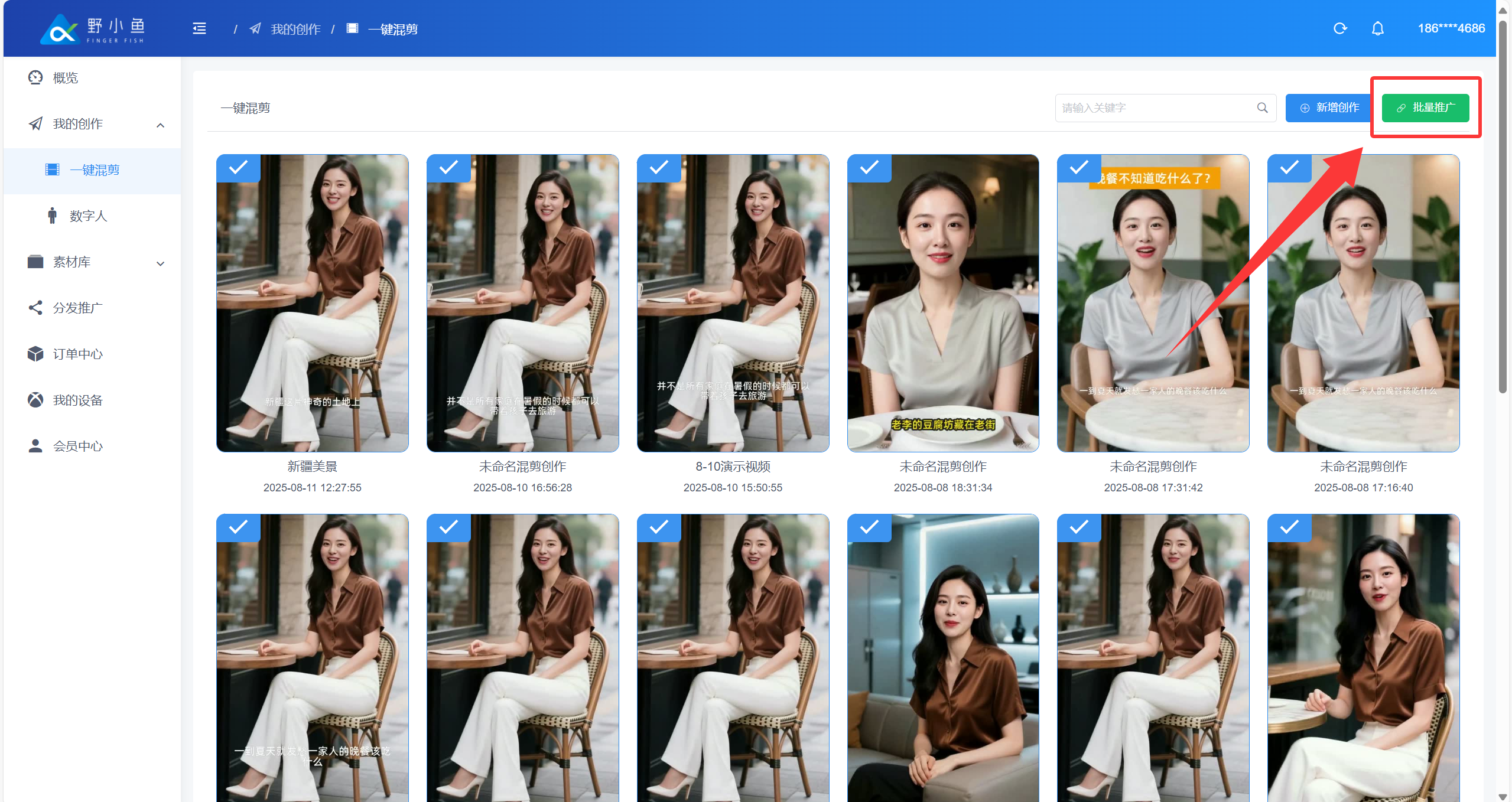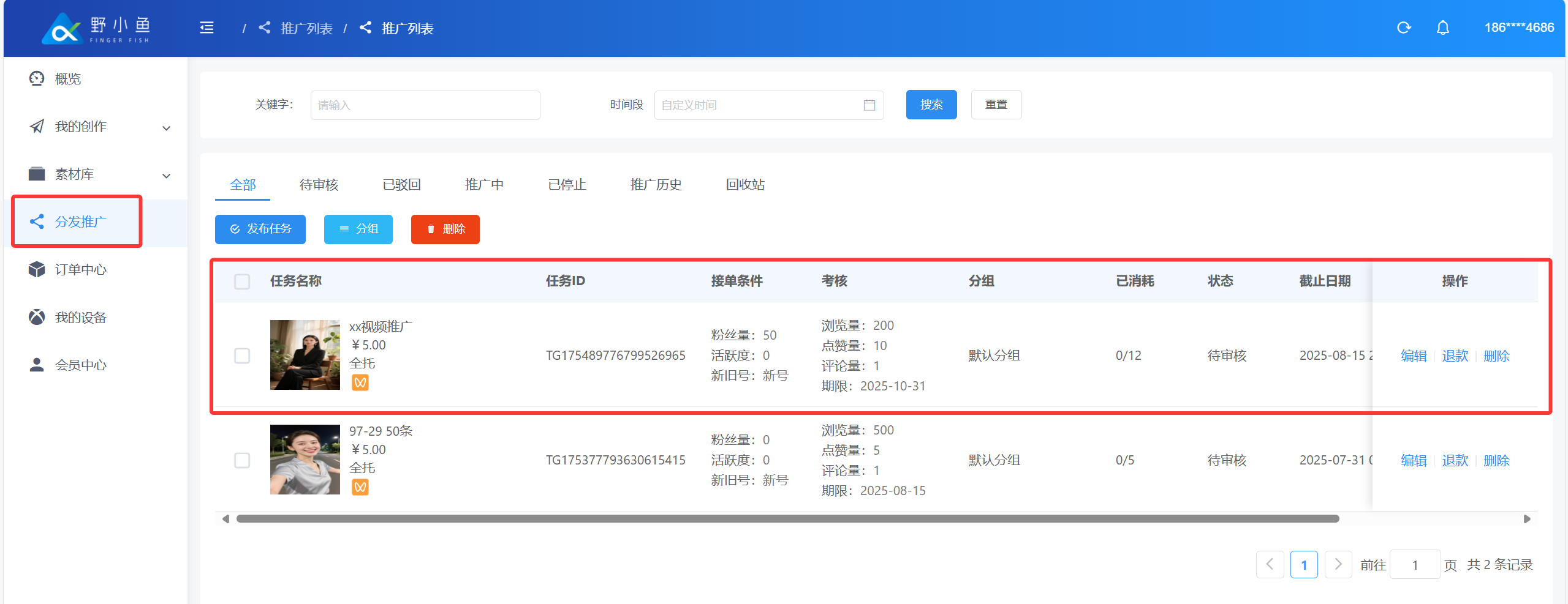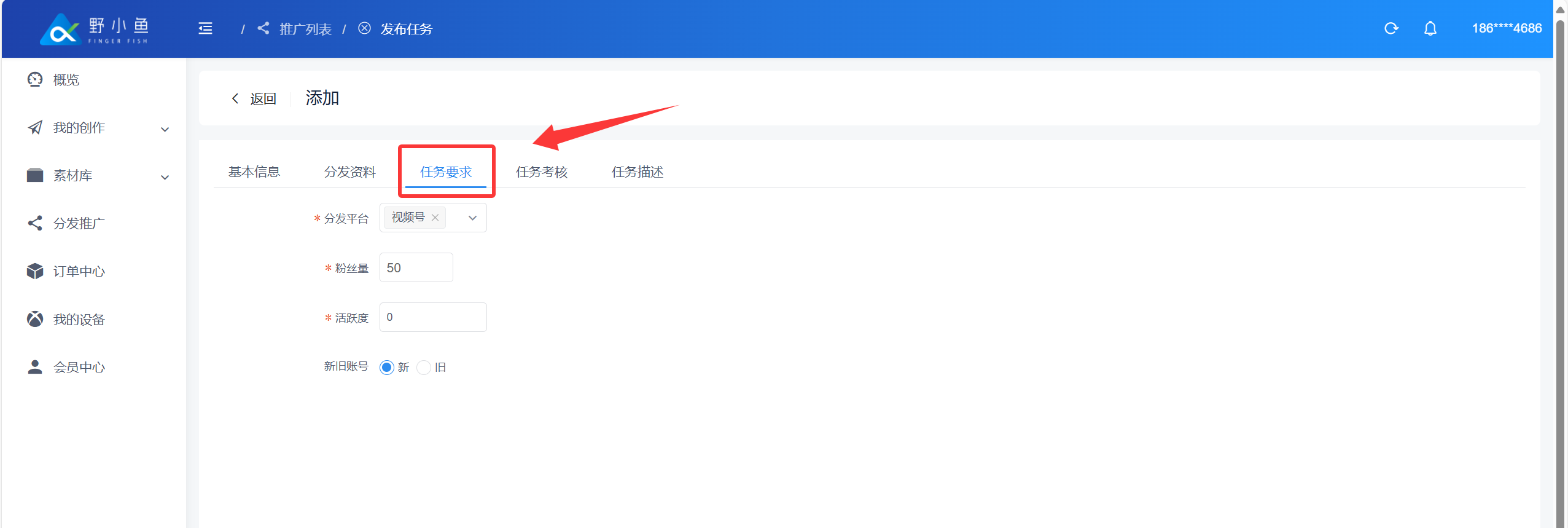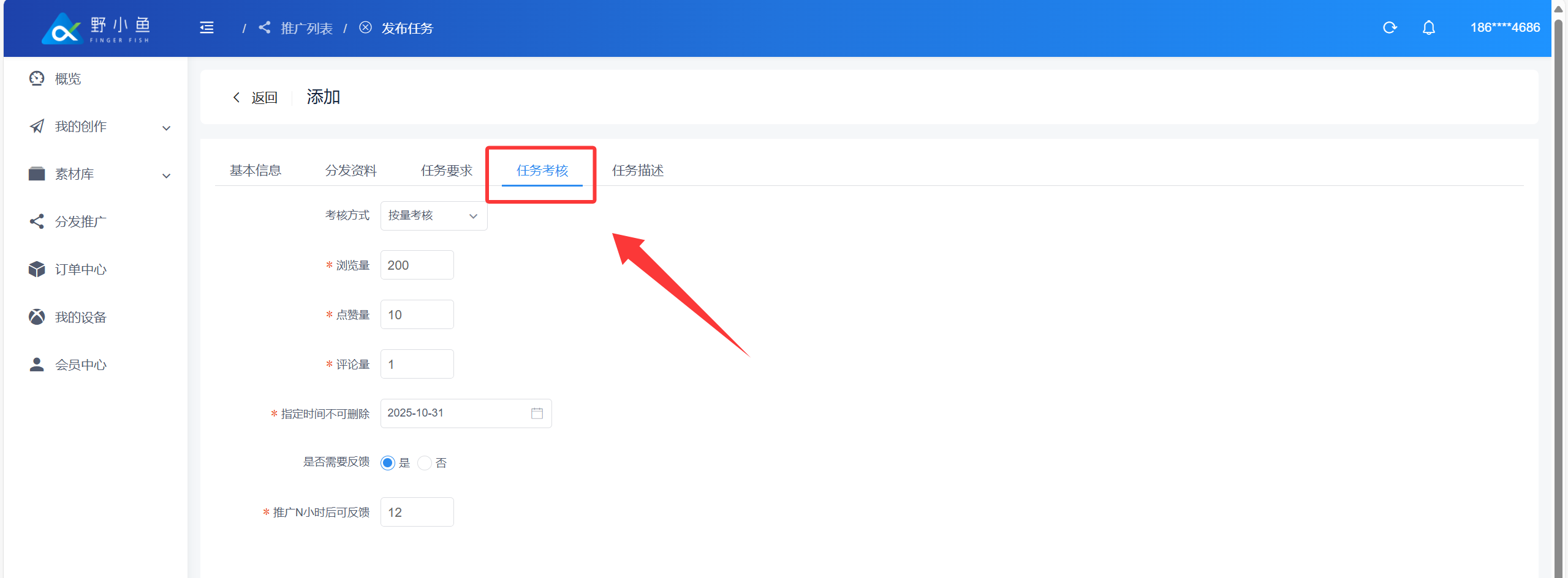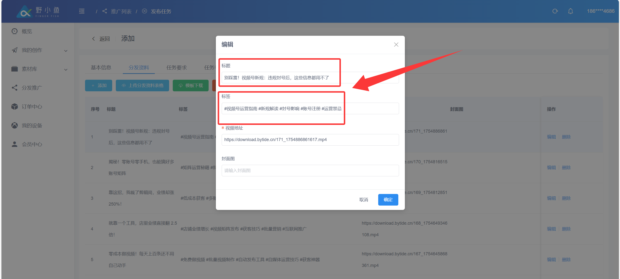 ## 什么是内容分发任务? > ❤️ 内容分发任务是指:企业或个人借助野小鱼任务分发系统,将自身内容(视频)指派给系统连接的 10 万 + 个人分发者(涵盖宝妈、兼职者等群体),由分发者在抖音、快手视频号等平台同步发布,形成传播矩阵的任务形式。 > > 👍 系统通过智能匹配机制,按内容类型自动派单(如美食视频优先推给本地生活类分发者),确保受众匹配度超 80%;企业或个人无需采购更多设备、账号,仅支付 3 - 10 元 / 条的任务佣金,可大幅节省成本。 ## 创建内容分发任务 进入野小鱼创作平台:[>>>> 进入野小鱼创作平台](https://b.bytide.net/home/) ###### * 批量添加 1、点击“我的创作”再选择“一键混剪”按钮 2、再点击“批量推广”按钮,对创作完成的视频进行勾选  ###### * 视频选择 当鼠标移动至视频封面时,左上角会出现“√”号,进行点击选中,一次可以勾选多个内容  ###### * 完成多选 完成多选后,点击右侧“批量推广”按钮  ###### * 依次填写任务要求  ###### 如下下图实例 1、添加任务标题 2、上传封面图片(非必须添) 3、任务类型(建议采用全托模式) 4、任务单价(每条任务发布者获得的佣金,建议不少于3元/条) 5、任务分组 6、截至日期(领取任务截至时间,在此时间范围内该任务均有效,建议至少3天)  ###### * 发布资料  ###### * 补充信息 补充完善标题信息和标签信息如下图所示  ###### * 任务要求 发布平台:选择你要发布到的平台类型 粉丝数量:指定粉丝数量在多少以上 活跃度:如果不知道怎么判断可以添加“0”建议添加为“60” 新旧账号:更具自生要求勾选  ###### * 任务考核 考核方式:建议采用“按量考核” 浏览量:可按照原有账号平均播放量进行考核指标填写,建议至少大于100 点赞量:更具原有内容(除爆款外)日常点赞了平均值,或适当降低标准进行考核 评论量:建议至少为1,可以要求发布者帮你进行至少第一个评论的引导 指定时间不可删除:这里建议时间至少一个月以上 是否需要反馈:默认“是”即可 推广N小时后可反馈:建议至少12小时后反馈数据  ###### * 任务描述 更具你的具体想法,添加描述。如下图所示,添加完成后点击“提交”  ###### * 任务确认 确认任务数量以及推广所需要费用,确认后点击“确定”  ###### * 任务查看 点击我“我的推广”查看任务列表,任务状态从“审核中”变为“推广中”即任务执行中